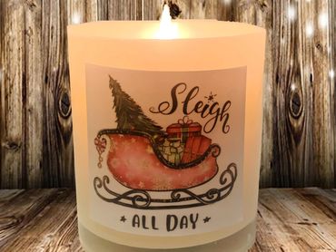 Sleigh All Day Candle in 10 oz Glass with white inside with silver metal lid. Soy - blend wax with all cotton wick and a great Holiday Splendor fragrance with a festive blend of holiday spices, cinnamon, clove, and nutmeg. Cheerful oranges and berries are the stars of this fragrance with a base of warm vanilla. 8 oz candle glass measures 3.85" tall and 3.18" diameter
